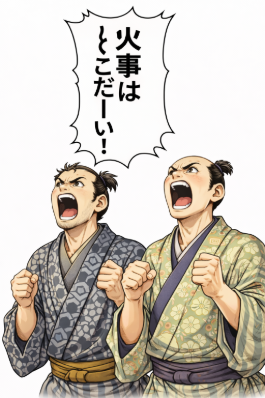 「煙が立つ~!!」 「それはわかってるよ!火事はどこだ~い!」 「海山越えて~!!」 「そんな遠くじゃ俺は行かねえ。」