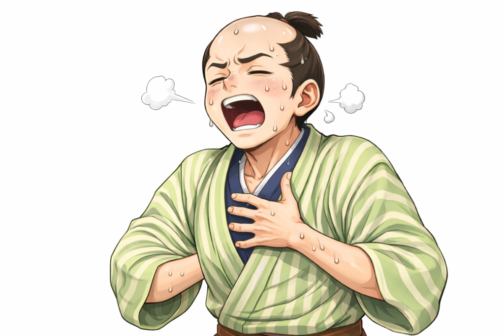 櫓に上がって、八つぁん「海山越えてこの世に住み慣れて・・・・・・ここが高い声だと言ってたな・・・・・(思い切り甲高く大きな声で)煙が立つう!」