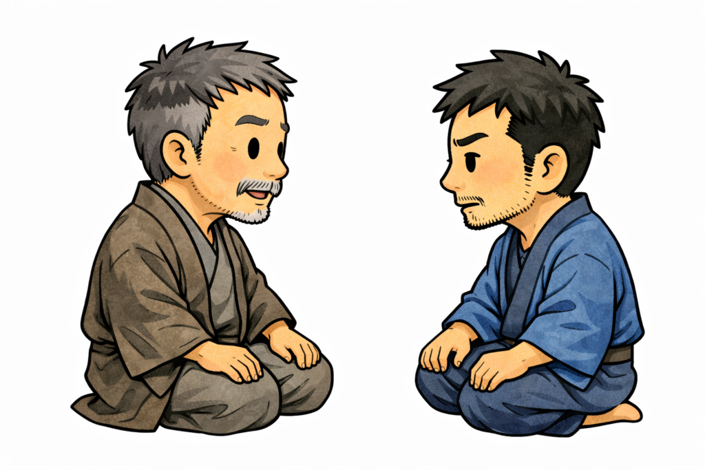 お滝さんは新しく亭主になった自分の事を何て呼んでくれるのだろうと吉兵衛は一人思い巡らせていた。「『お滝・あなた』が良いだろうな」、何遍も大きな声で言っていると隣から「うるさい」と、怒鳴られた。「では湯屋にでも行こうかな」と外に出たら、鉄瓶を提げていた。