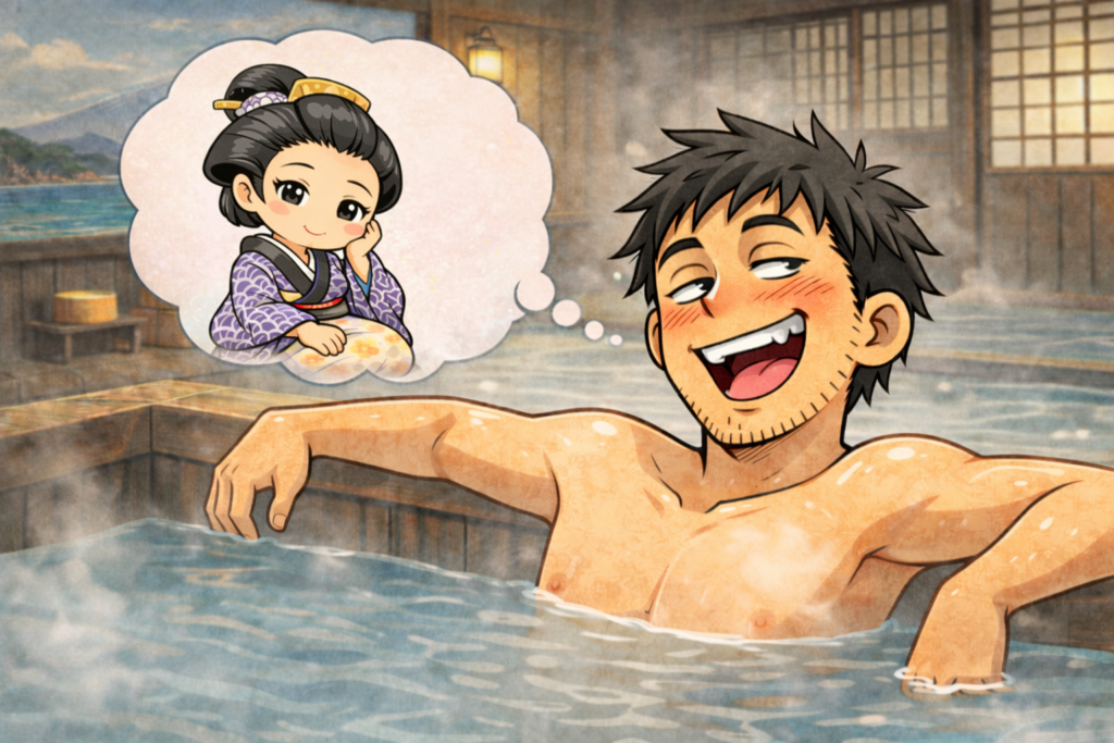 湯屋に入ると、混んでいた。「みんなは汚れを落としに来ているんだが、自分は婚礼の晩だから・・・、婚礼の晩なんて奴は居ないだろうな」、湯が熱いのでかき回して「『あなたは湯上がりだと綺麗だわ』なんて言ってくれるだろうか」彼は一人世界に入っていて、周りの人が居るのもお構いなし。