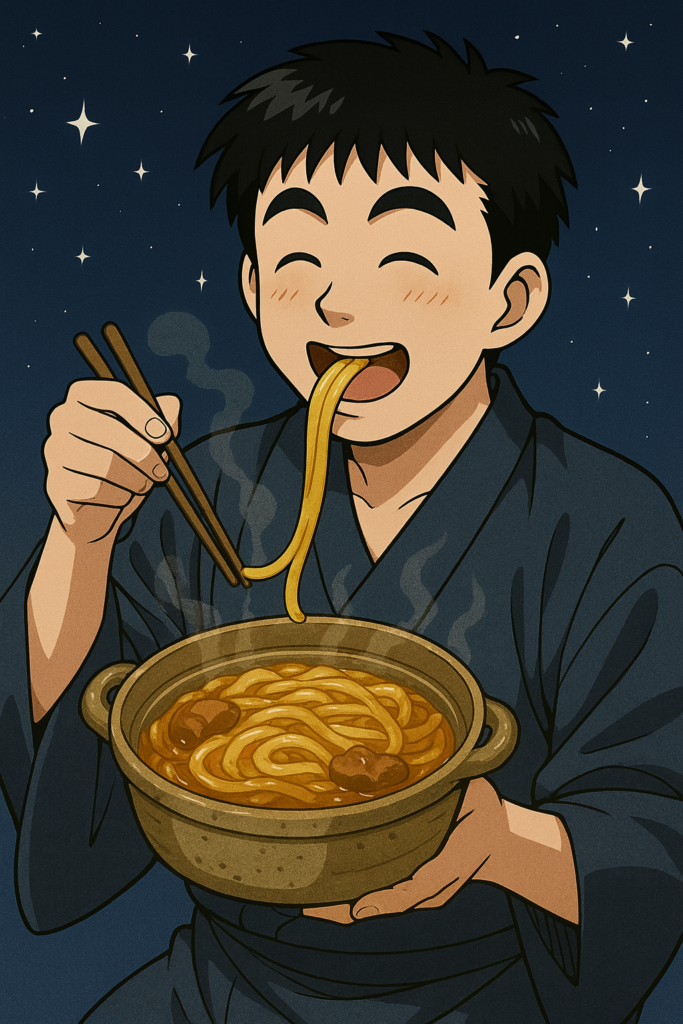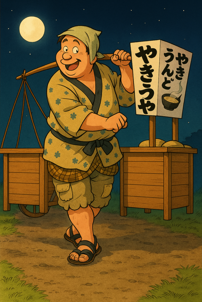 ある寒い夜、屋台の鍋焼きうどん屋が流している。