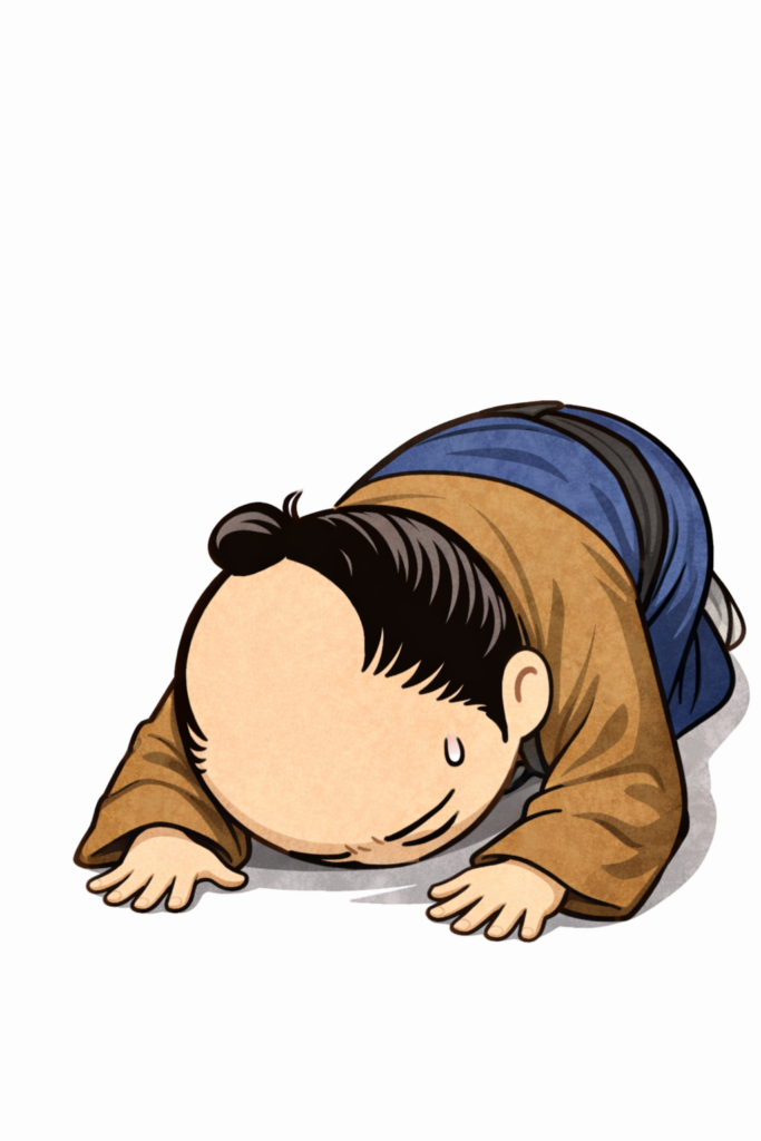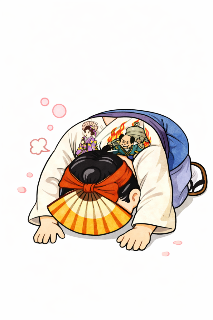 扇子を首に縛りつけて顔を隠し、長襦袢一枚に。