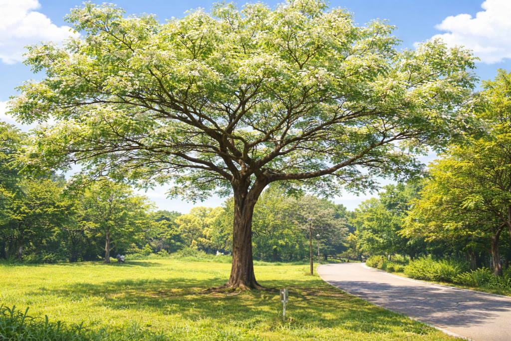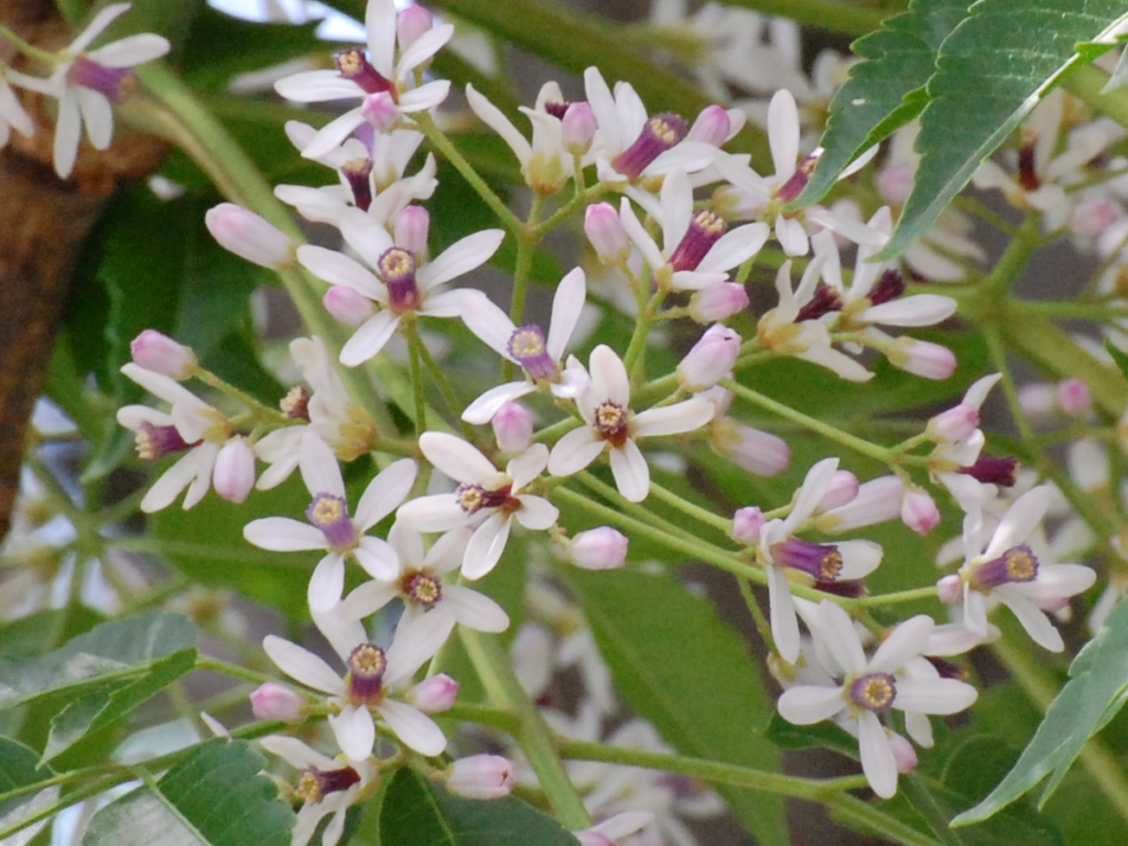 栴檀は初夏(5 – 6月頃)に淡紫色の5弁の花を多数、円錐状につけます。