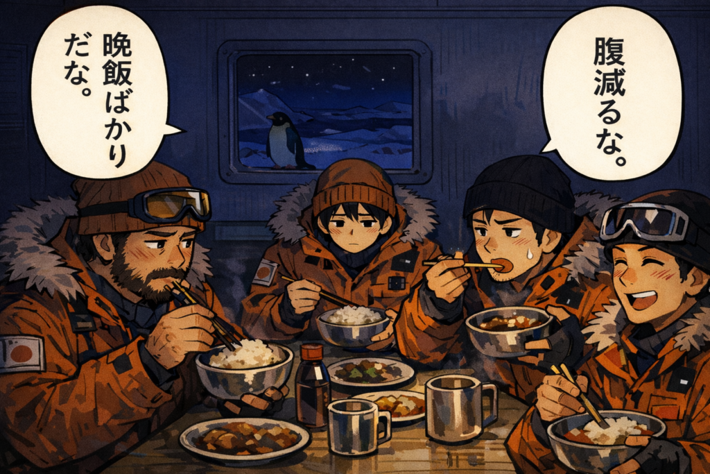 「これ一年間越冬村で暮らしましてね。南極の夏は困るんですよ」、「何が」、「夜が無いんですよ」、「そうなんだってね」、「明けても暮れても昼間ばかりですよ。困んのは御飯なんですよね。今食べてんのが朝飯だか昼飯だか晩飯だか見当がつかない。しょうがないから昼飯ばかり、朝飯と晩飯が抜きになるから、腹が減って、腹が減って」、「変な話だな」。「逆に冬になると、夜ばかりで昼間が無いんですよね。困んのは御飯なんですよ。今食べてんのが朝飯だか晩飯だか昼飯だか見当がつかない。のべつ晩飯ばかり、朝飯と昼飯が抜きになるから、腹が減って、腹が減って」、