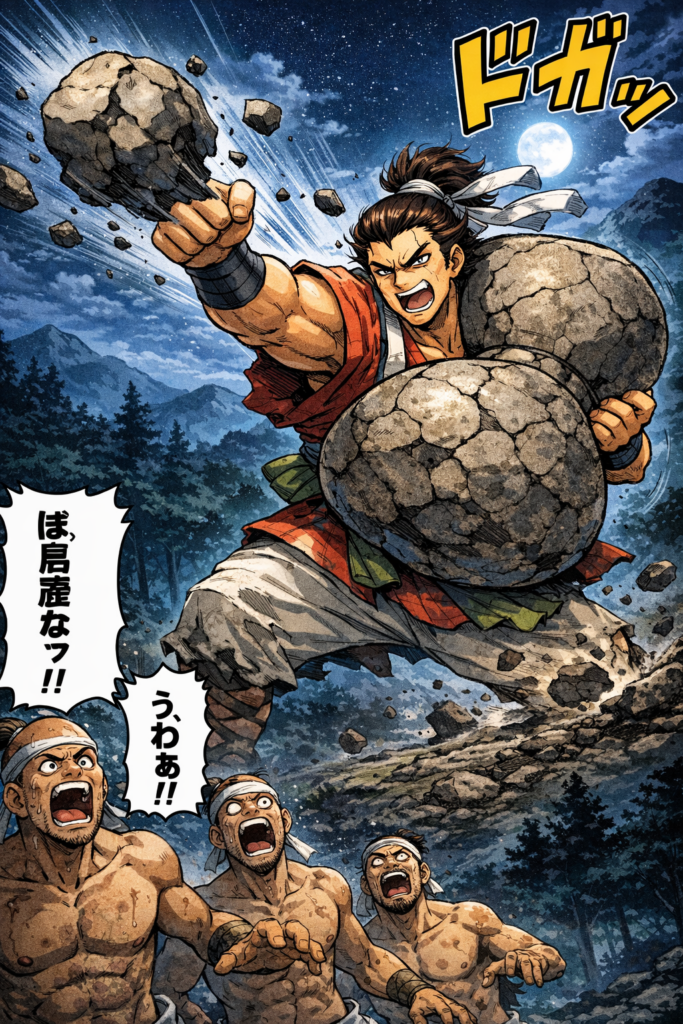 「3間(=約5.5m)四方の大岩を小脇に抱え……」「3間四方の岩が、小脇に抱えられるものかね」「それが、真ん中がくびれた瓢箪岩で。その岩をちぎっては投げ」「岩がちぎれるかい」「できたてで柔らかい」「お餅だよ、それじゃ」