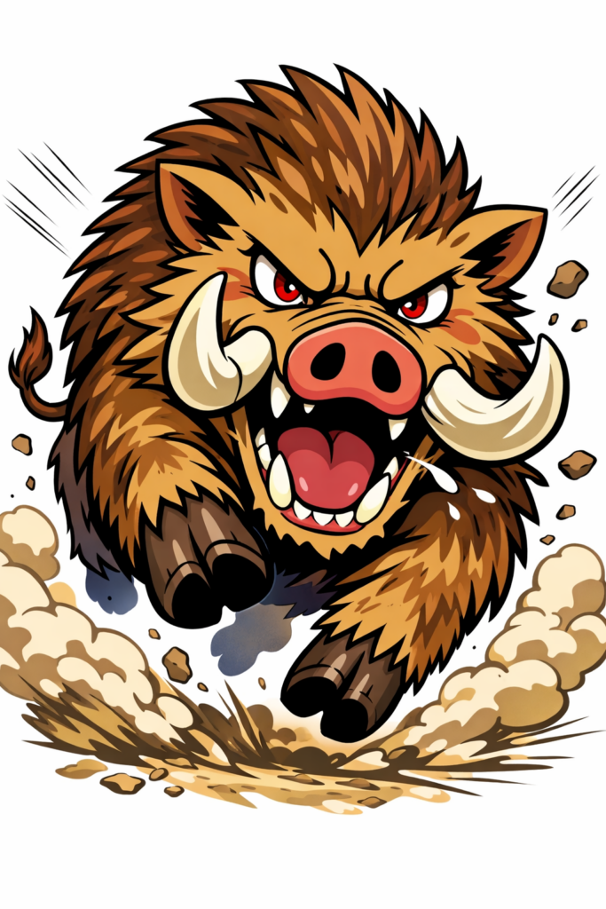 ホッとする間もなく、背中が3間ほども有る角が生えたイノシシが飛んできた。