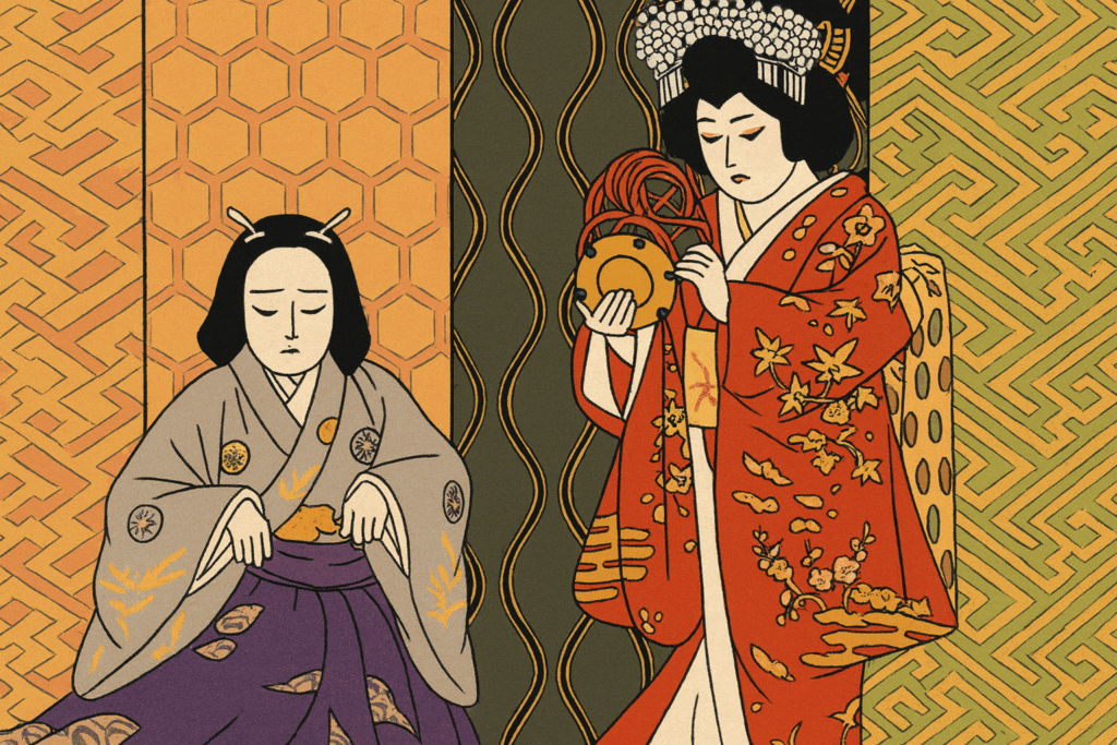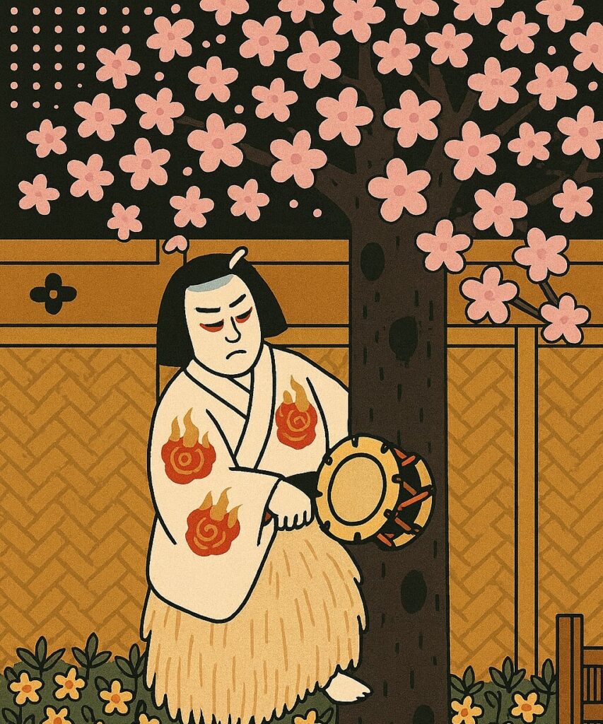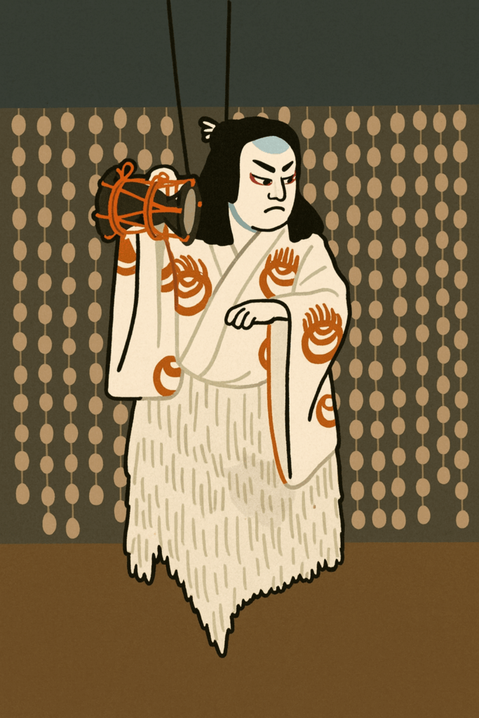 その昔、桓武天皇の御代のこと。天下が旱魃となって雨乞いをするため、大和の国の千年生きながらえているという雌狐と雄狐を狩り出し、その生皮を剥いで作った鼓を打つとたちまち雨が降りだした。その雌狐と雄狐の皮で作った鼓とは初音の鼓、自分はその鼓にされた狐の子だというのである。