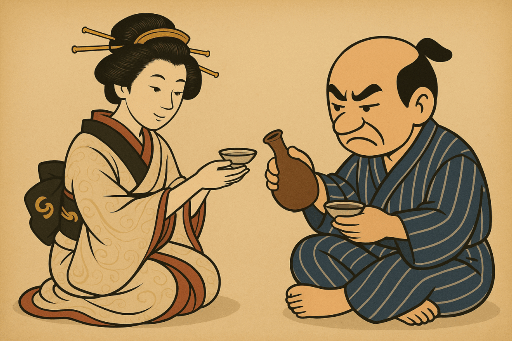 常吉は身持ちの固い男だからそんなの嘘だと信じなかった次郎吉だったが 師匠の家を覗いてみると言われたとおり二人は肩を寄せ合って酒を差しつ差されついい雰囲気